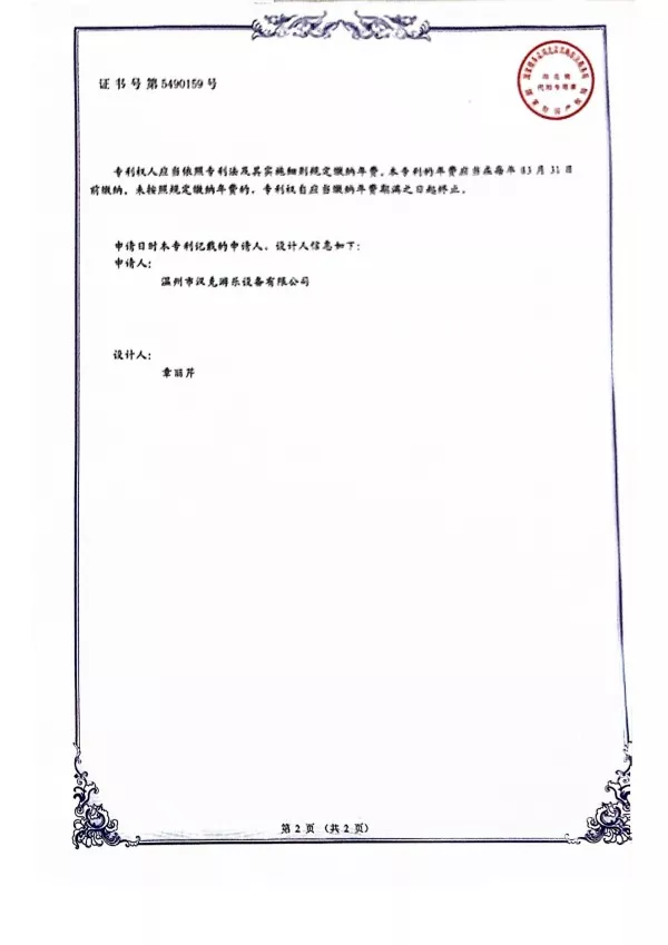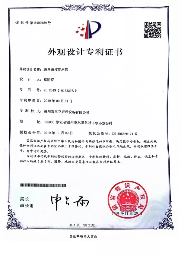 Сонымен бірге, Hank компаниясының меншікті өнімі ретінде біз 2019 жылы зебра тәрізді перкуссиялық құрал стендіне арналған дизайндық патенттік куәлікке жүгініп, Қытай зияткерлік меншік бюросының мақұлдауын алдық.